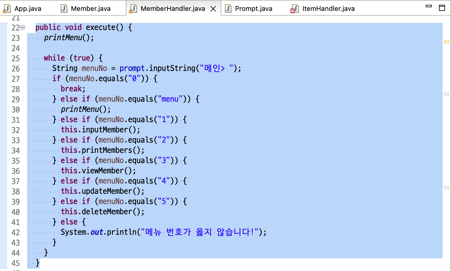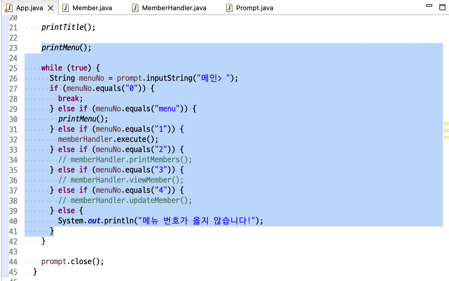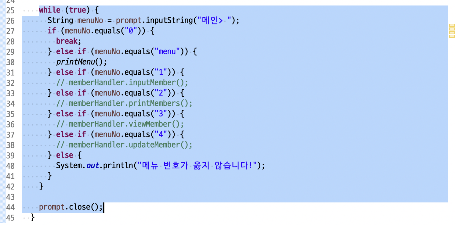 String menuNo = prompt.inputString("회원> ");