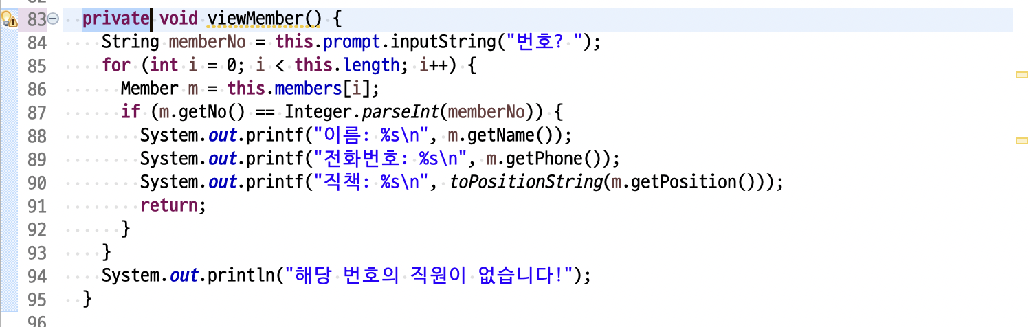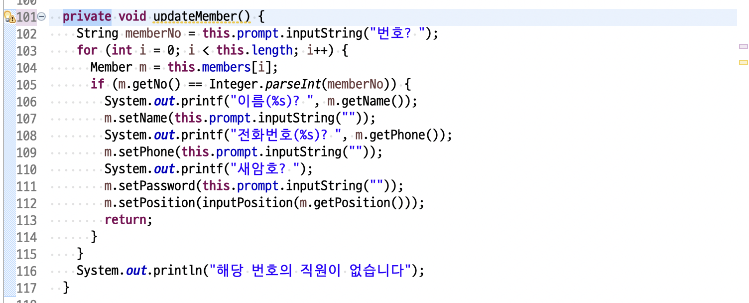 이제 inputMember(), printMembers(), viewMember(), toPositionString(char position), updateMember(), inputPosition(char position), deleteMember(), indexOf(int memberNo), available()는 memberHandler 클래스 내부에서만 사용되므로 private 이 아닌 메서드 private 으로 변경