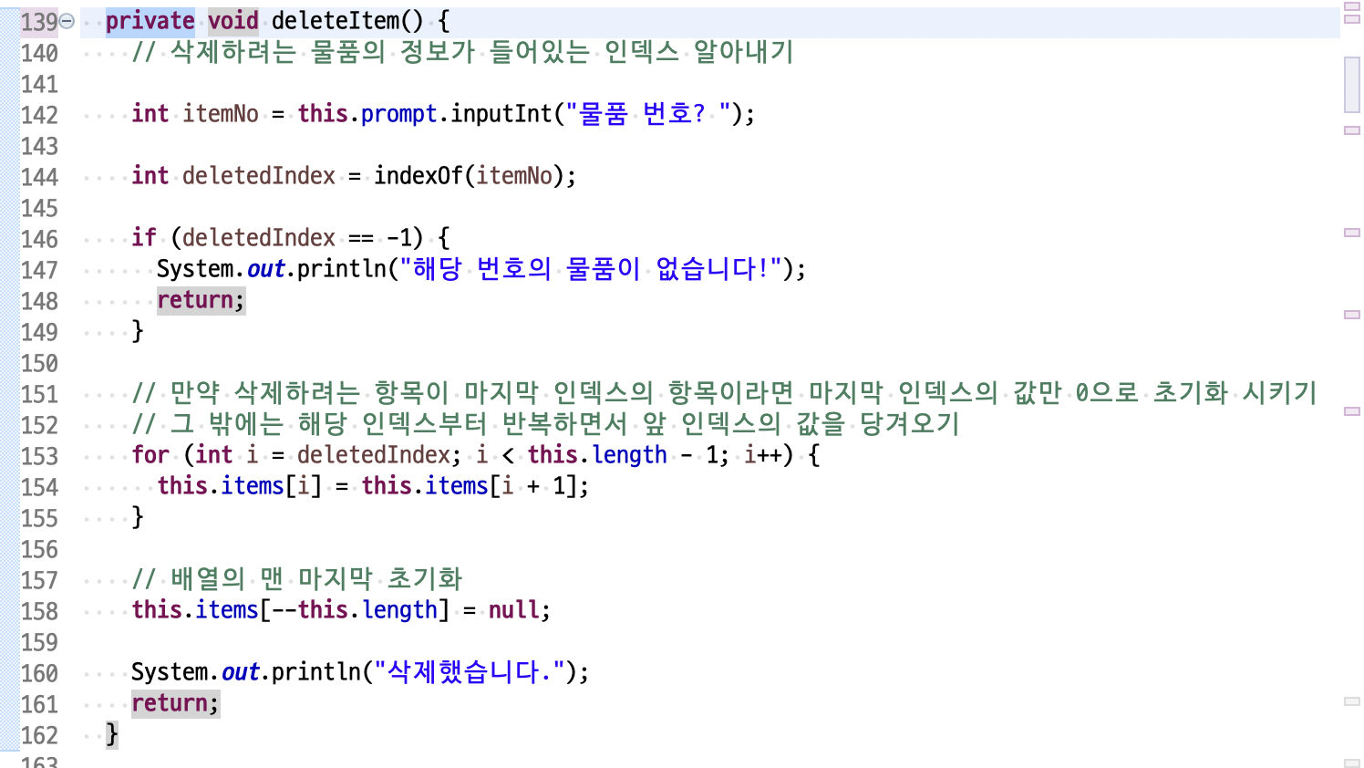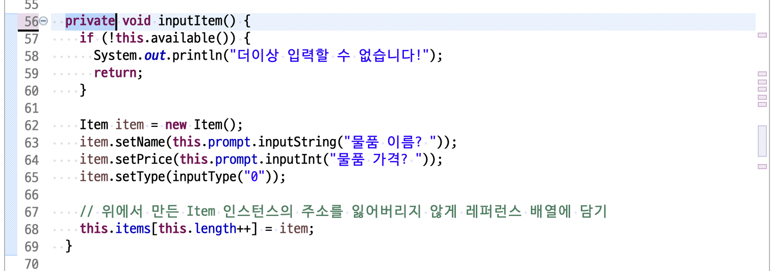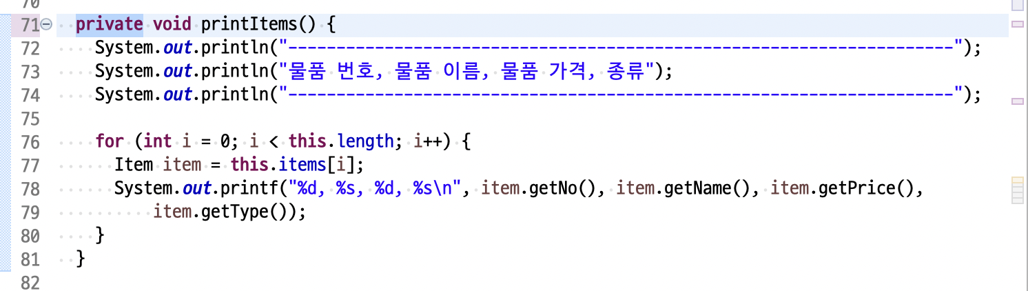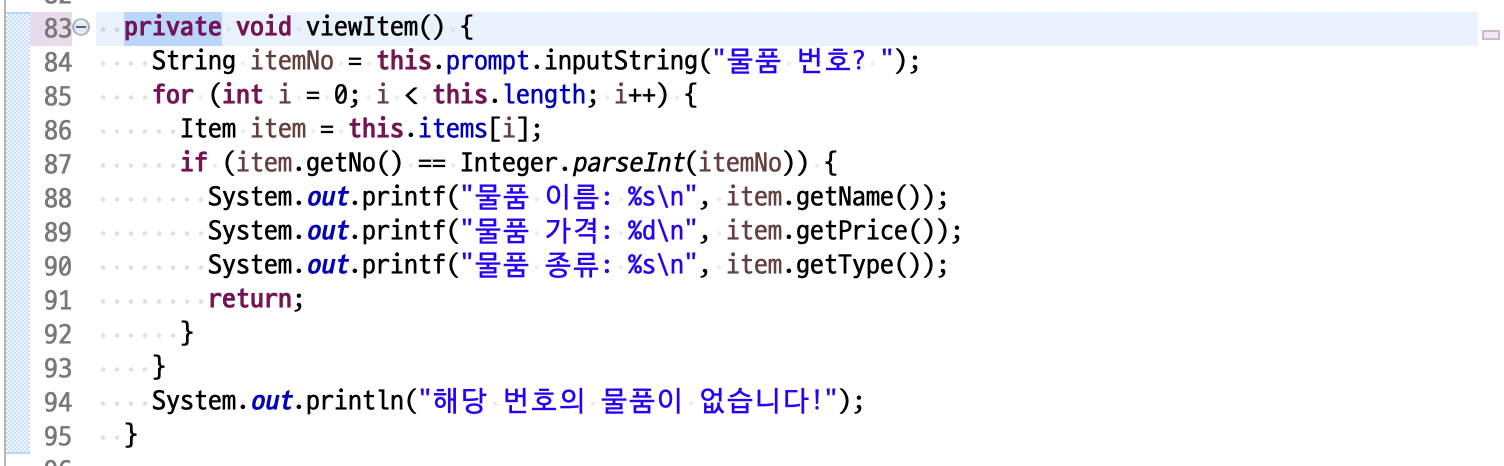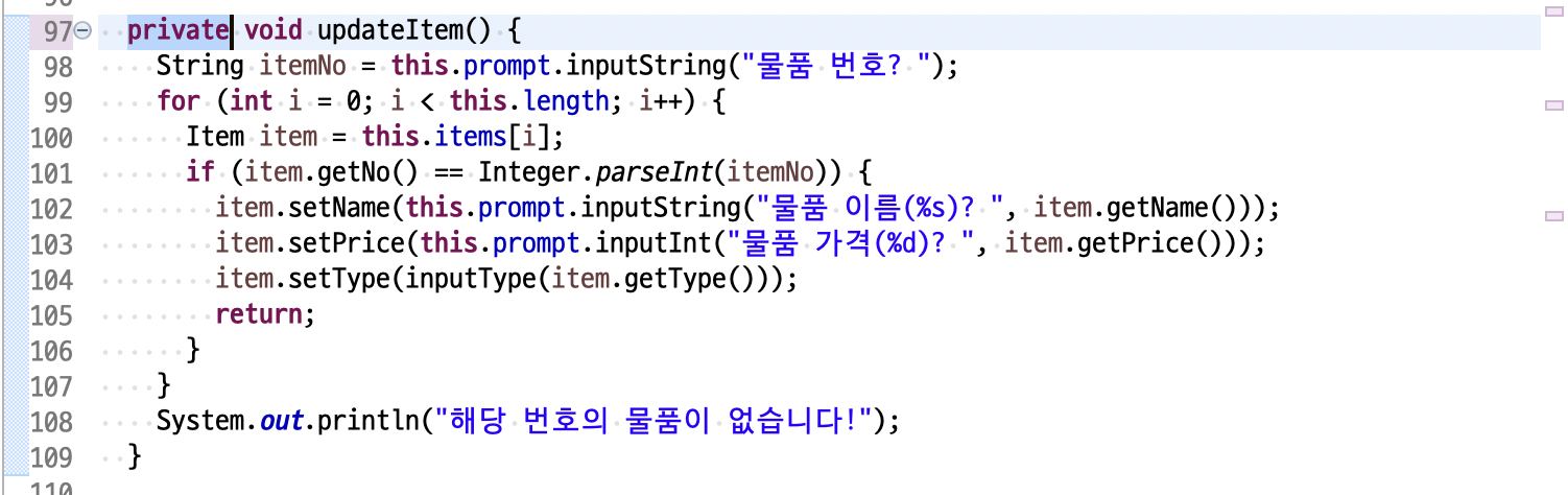 이제 inputItem(), printItems(), viewItem(), updateItem(), inputType(String type), deleteItem(), indexOf(int ItemNo), available()는 ItemHandler 클래스 내부에서만 사용되므로 private 이 아닌 메서드 private 으로 변경