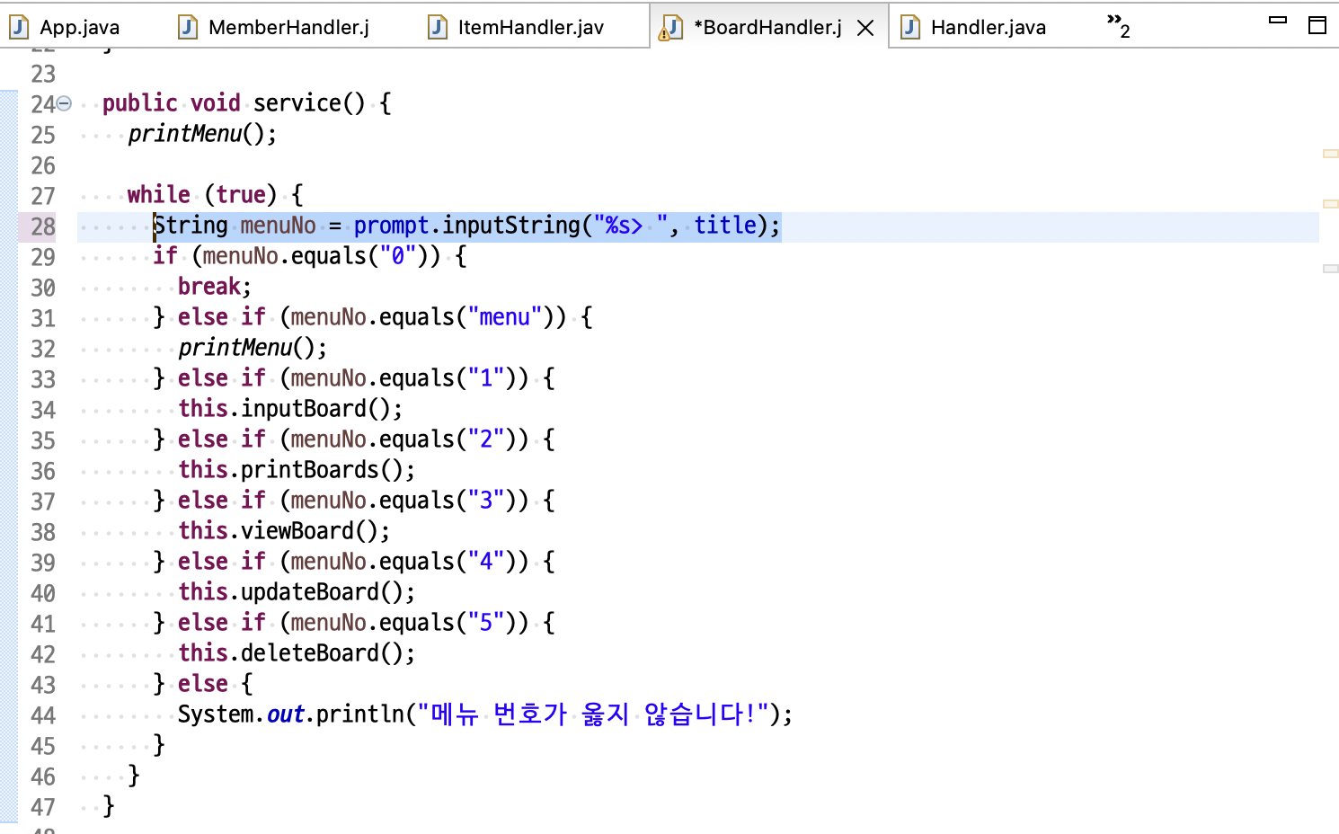 => BoardHandler 의 service() 실행하여 게시글에 대한 printMenu() 를 출력하도록 함