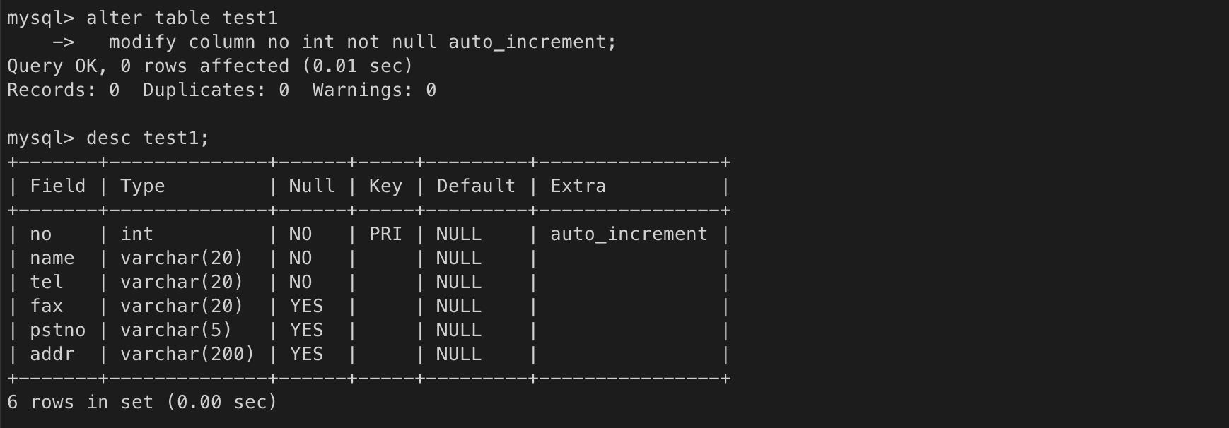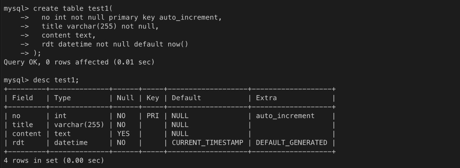 no 컬럼은 필수 입력 컬럼이지만, 자동 증가 컬럼이기 때문에 값을 입력하지 않아도 됨