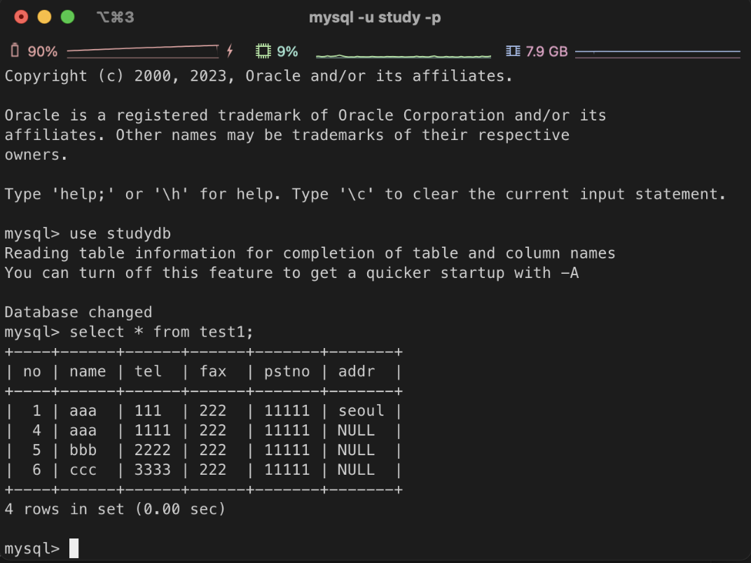 ㄴ study 라는 계정으로 MySQL 접속 후 studydb 를 기본 데이터베이스로 설정
