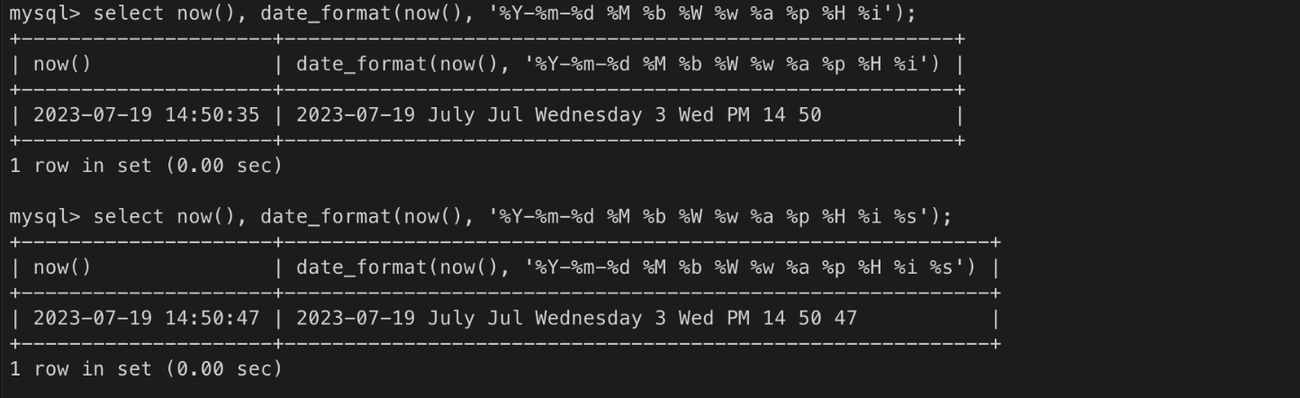 select now(), date_format(now(), '%p %h %H %l'); /* PM 01 13 1 */