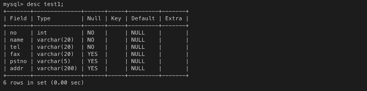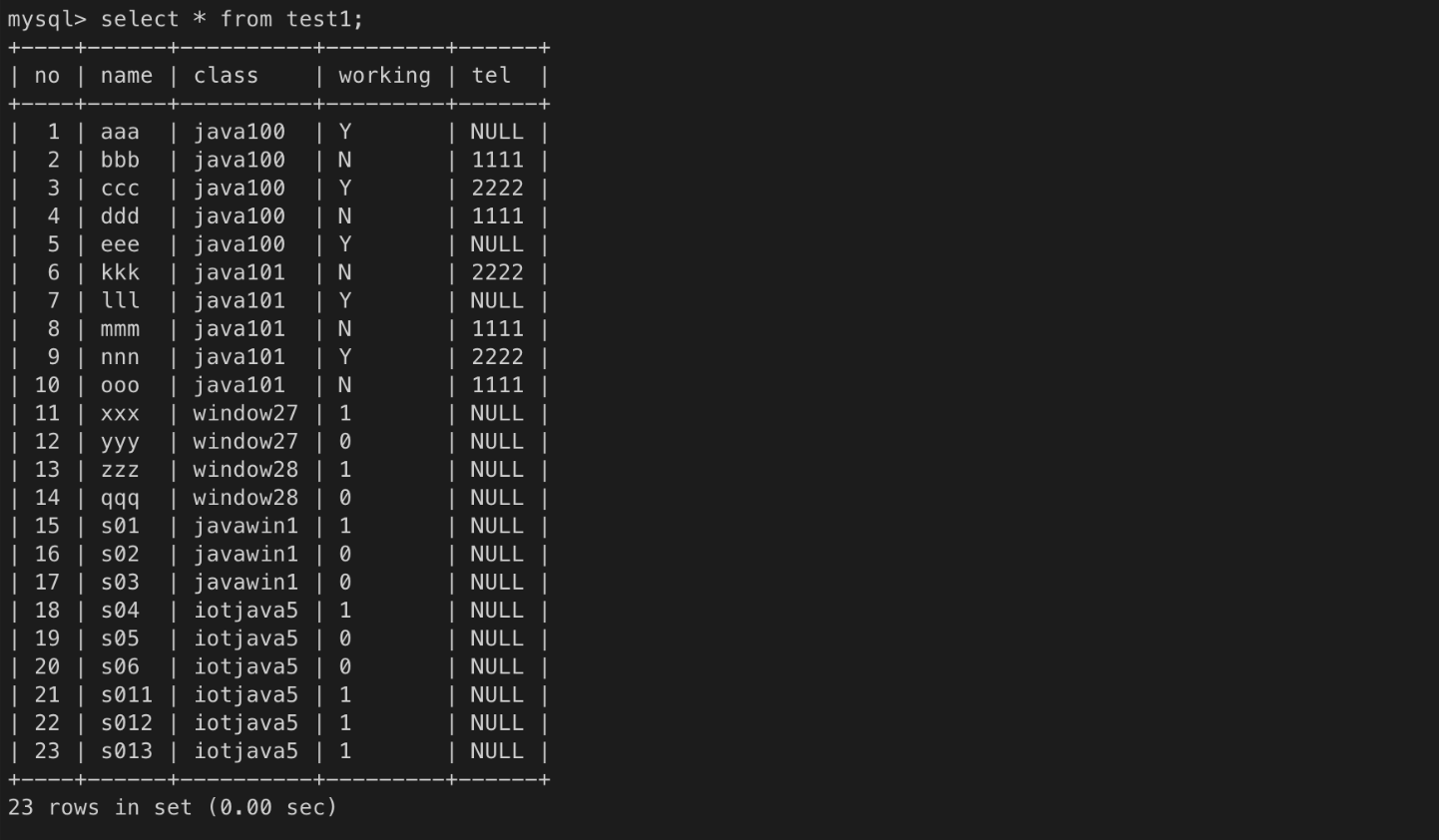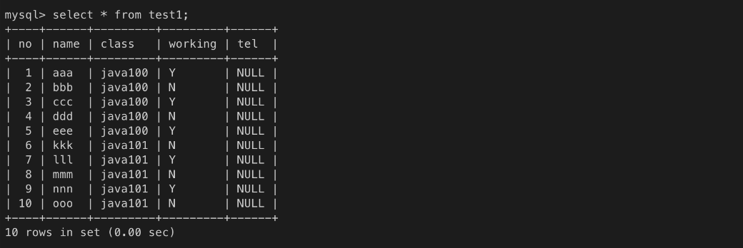 모든 컬럼 값 조회하기. 컬럼 순서는 테이블을 생성할 때 선언한 순서.