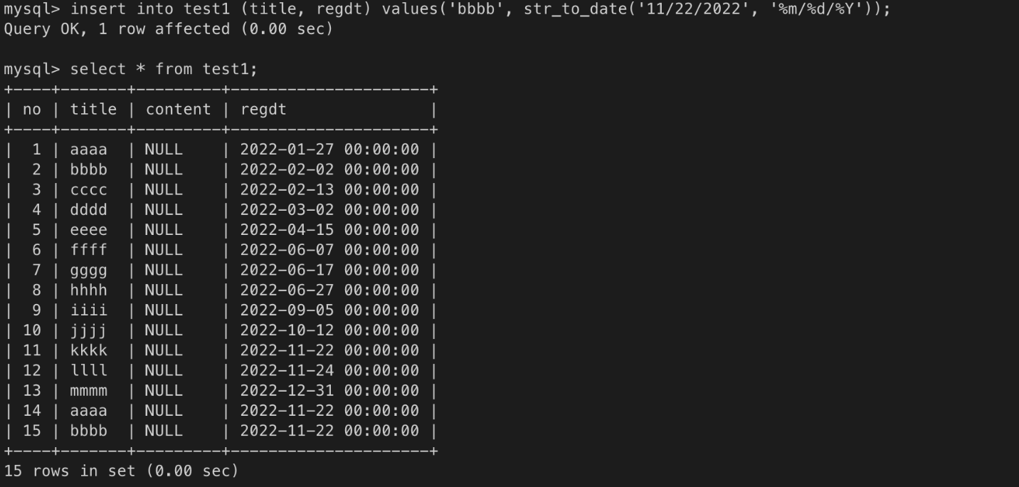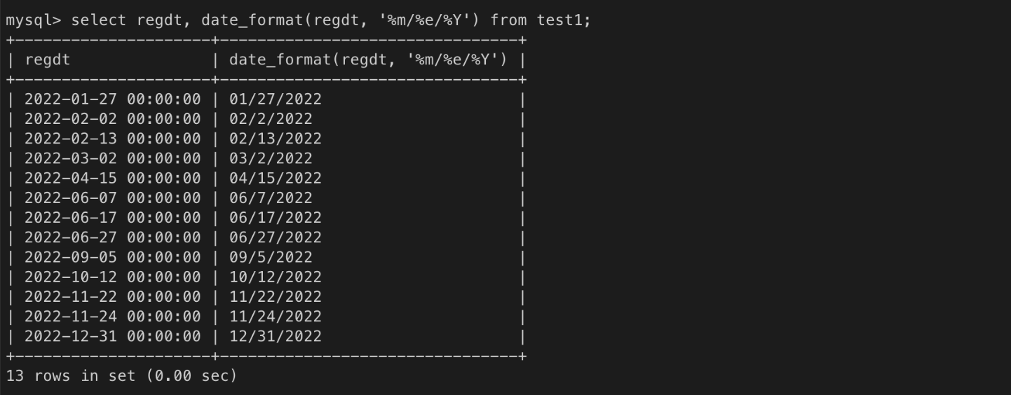 select regdt, date_format(regdt, '%m/%e/%Y') from test1; /* 09/7/2022 */