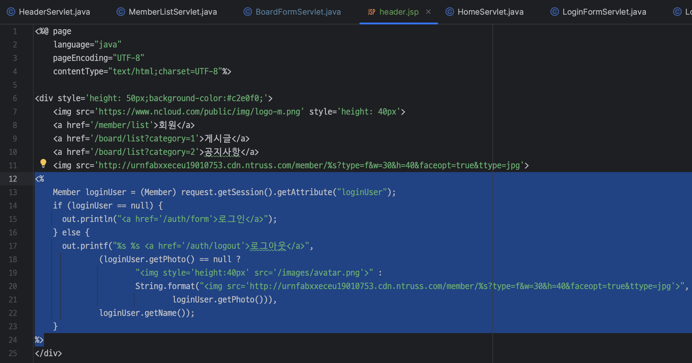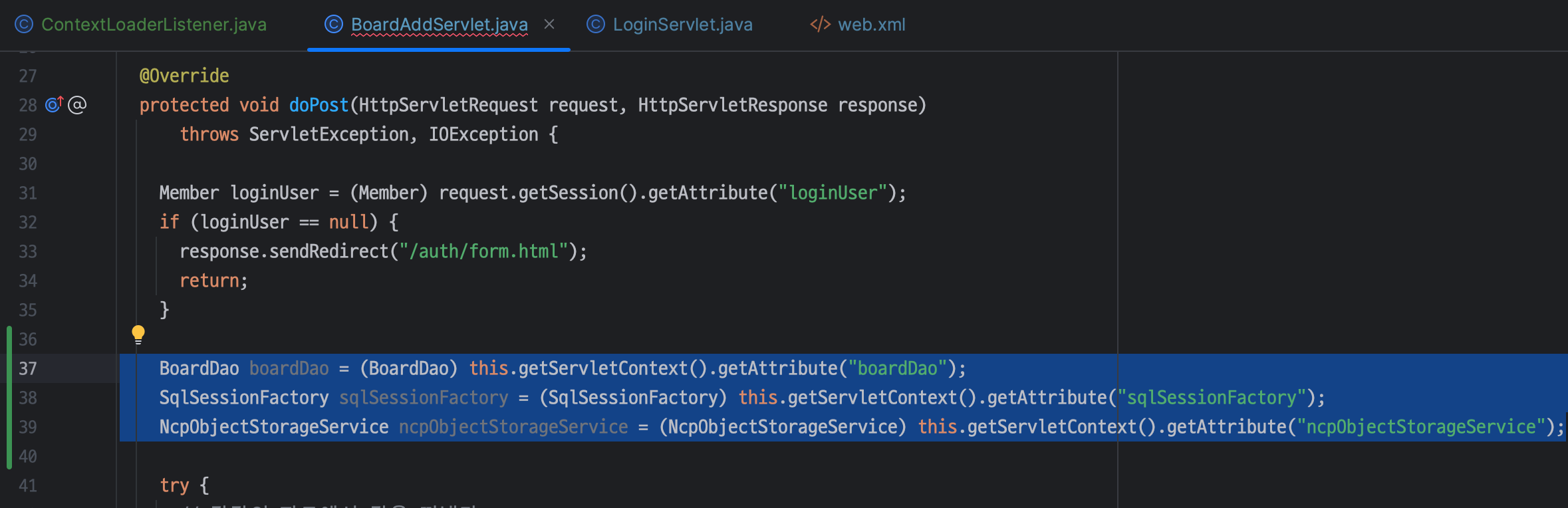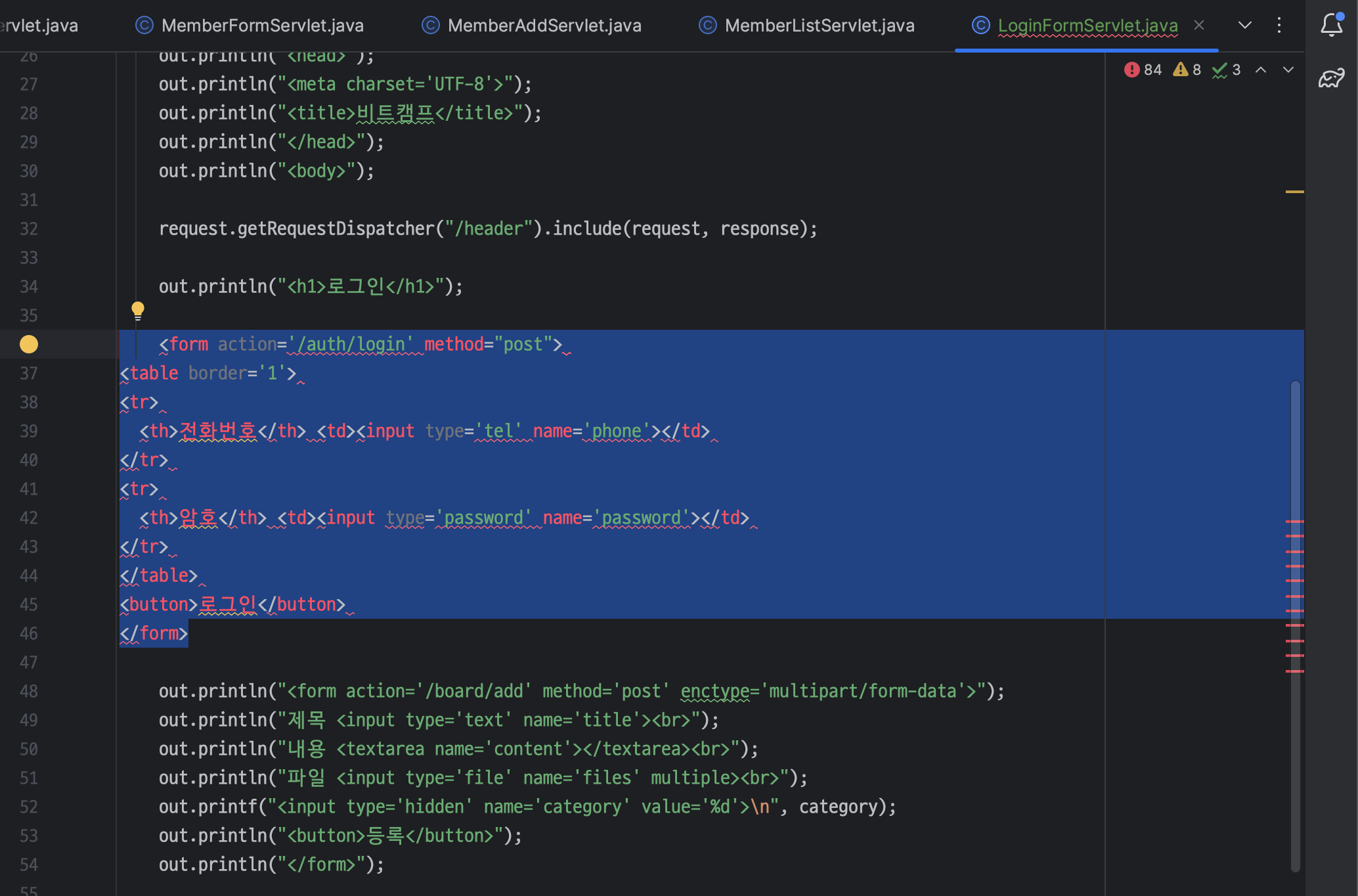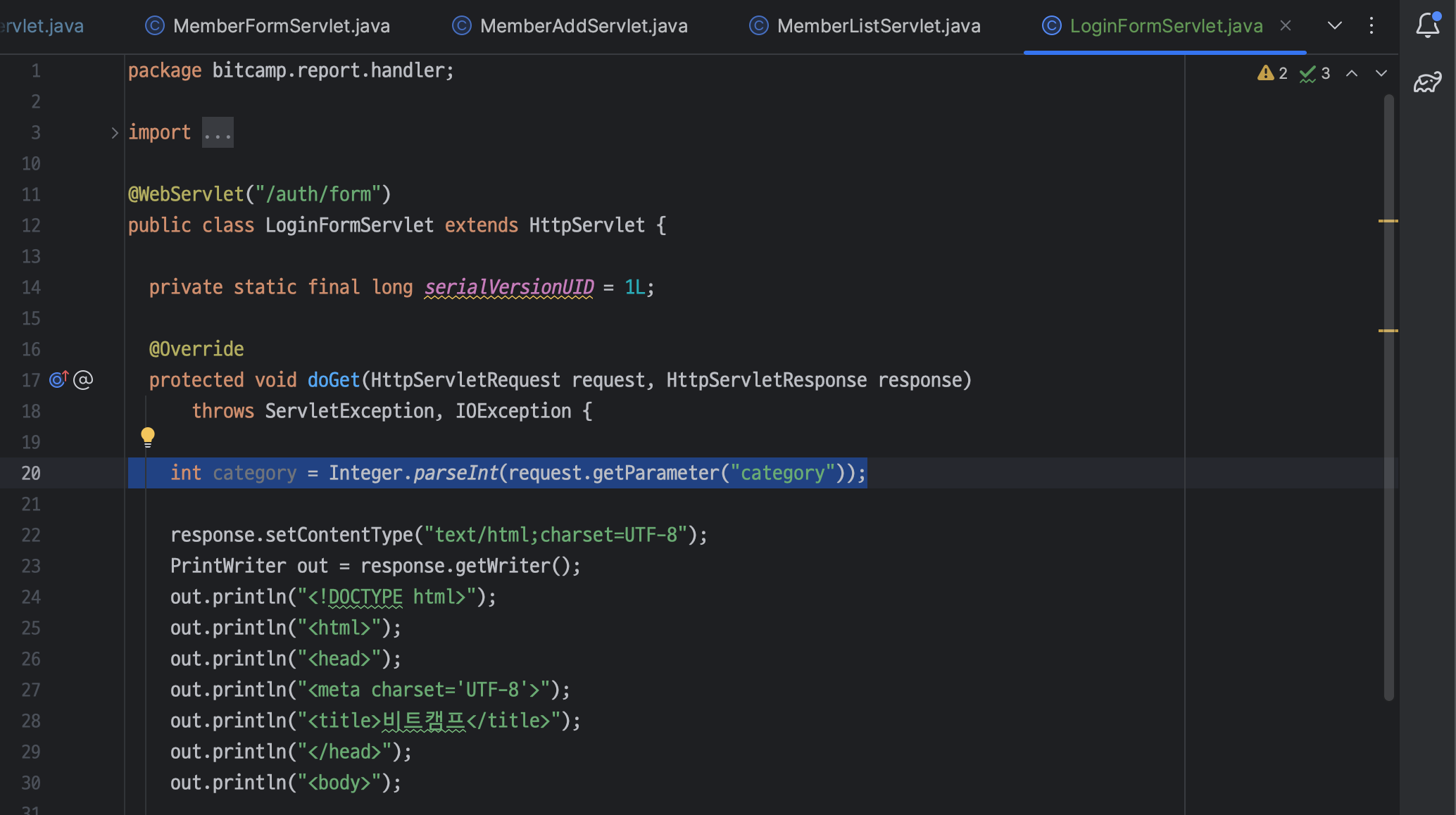 ㄴ LoginFormServlet 은 BoardFormServlet 과 다르게 category 가 필요 없음