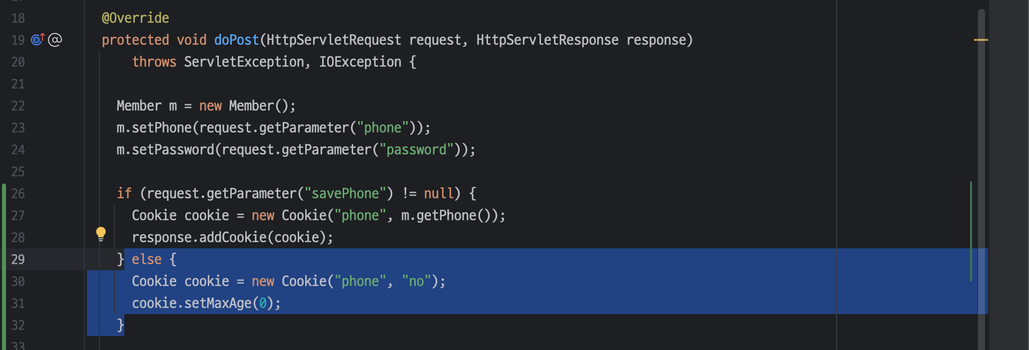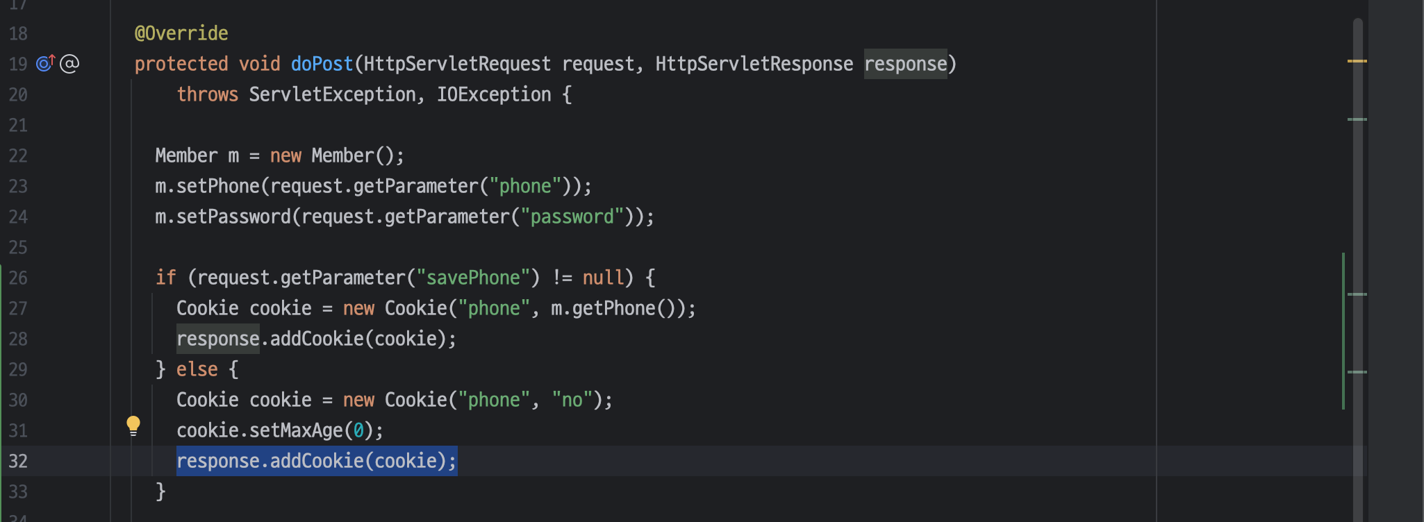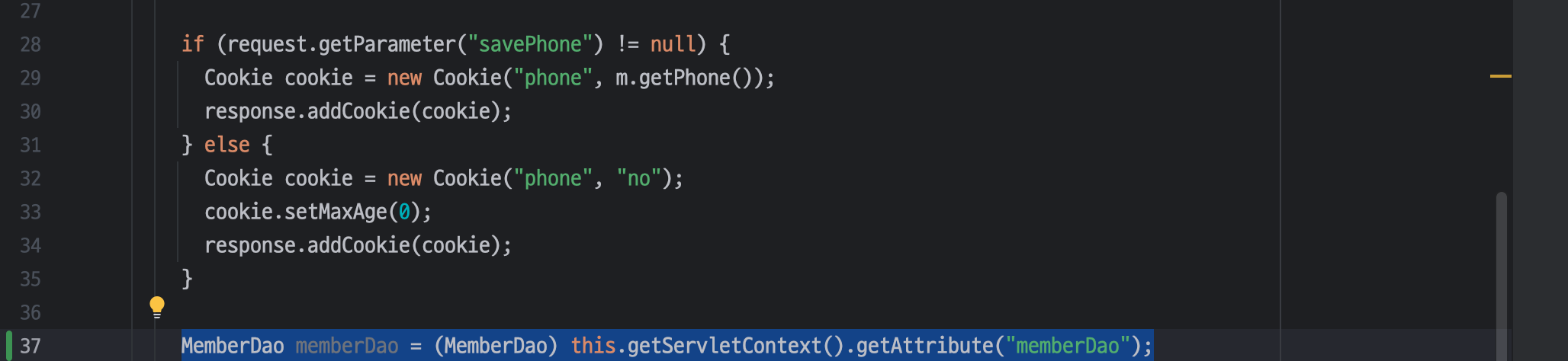 ㄴ 넘어온 파라미터 값 중 savePhone 이 있다면 쿠키 생성하여 서블릿에서 클라이언트로 쿠키를 전송하도록 함