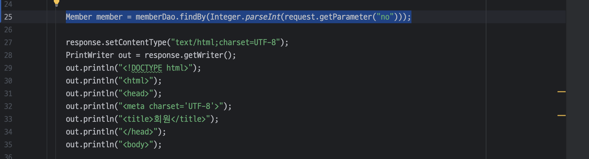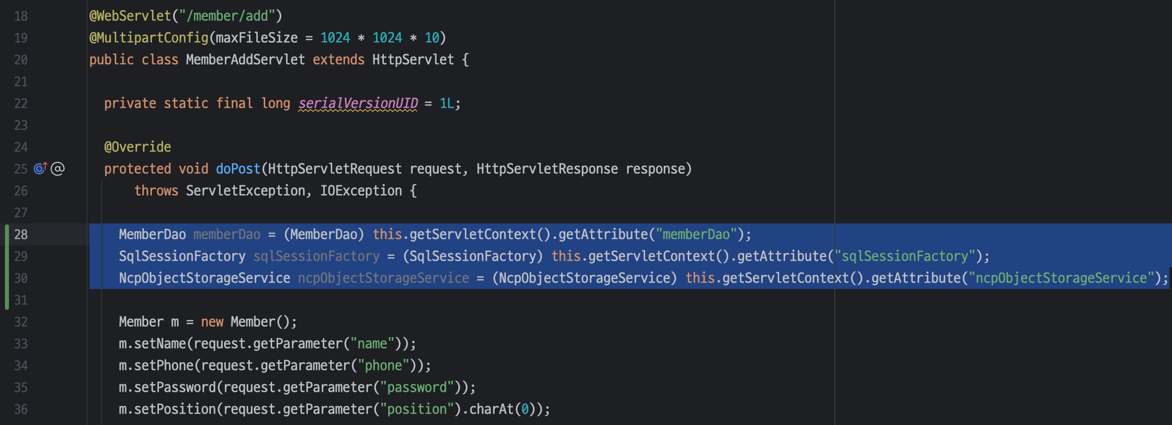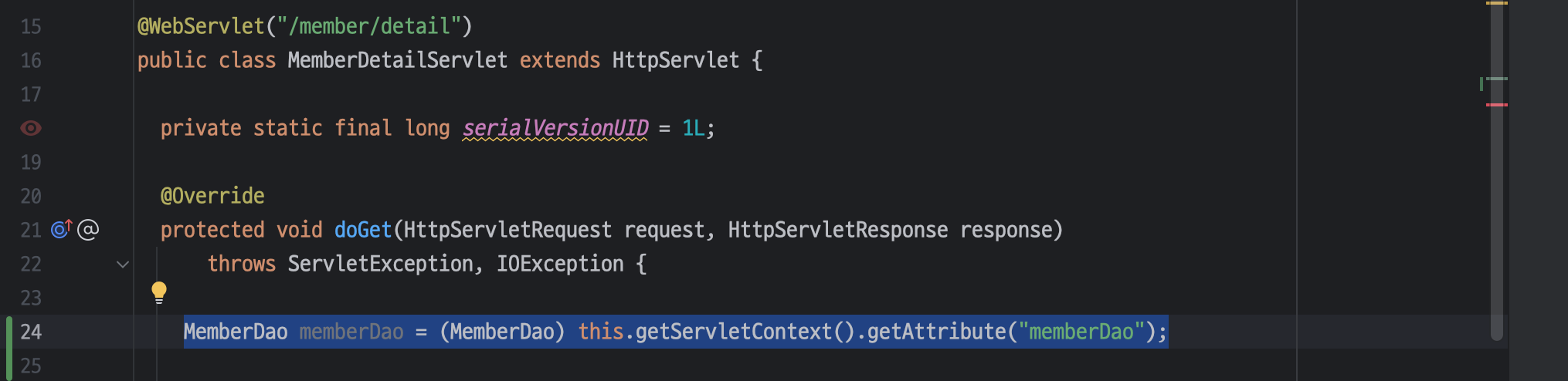 ㄴ 서블릿 컨텍스트에서 "memberDao"라는 이름으로 저장된 속성(Attribute) 값을 가져오는 부분