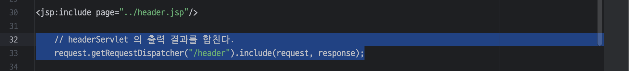 ㄴ 아래쪽 코드 대신 위쪽의 <jsp:include> 태그를 사용하여 JSP 페이지에서 다른 JSP 페이지를 포함하거나 삽입하도록 함