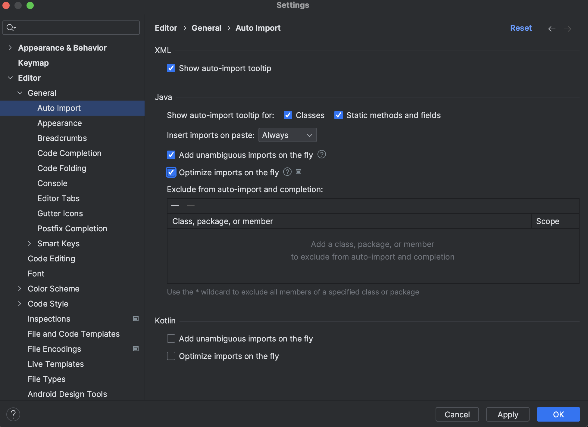 ㄴ Editor > General > Auto Import 선택 > Optimize imports on the fly 체크박스를 체크 > [OK] 선택