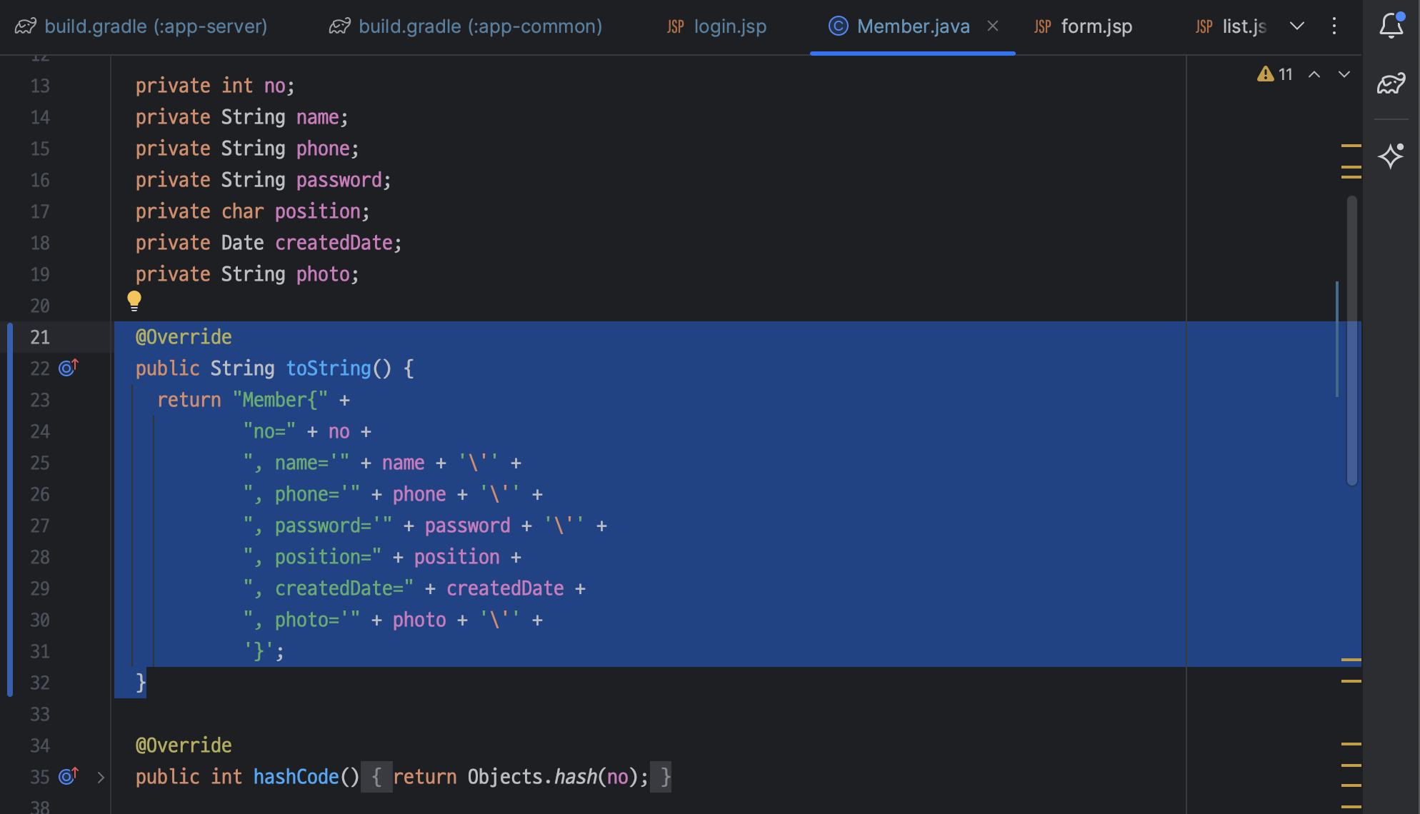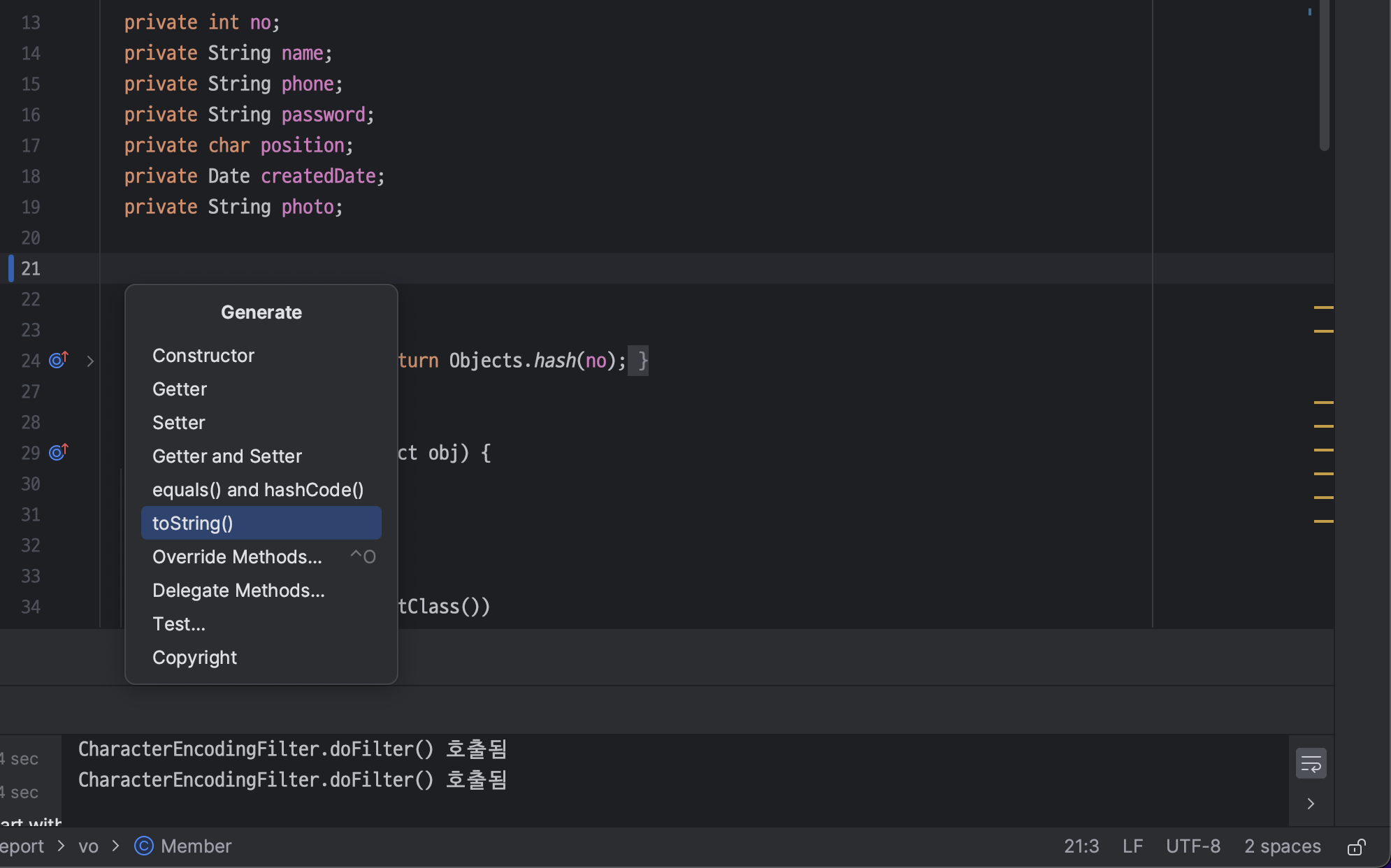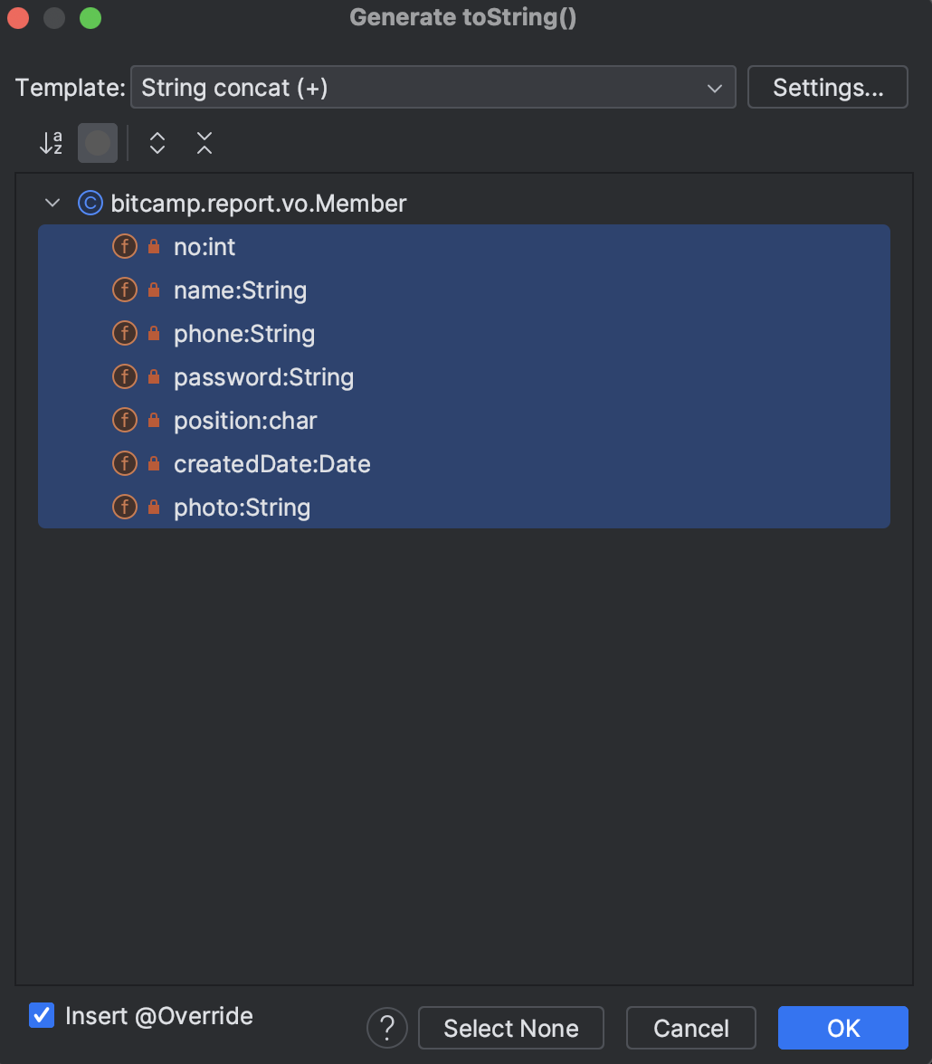 ㄴ 우클릭 > Generate 선택 > toString() 선택 (단축키 : command + N)