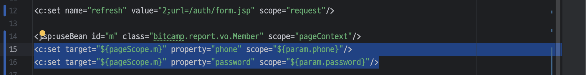 ㄴ JavaBean 객체(m)에 대한 phone과 password 속성을 설정