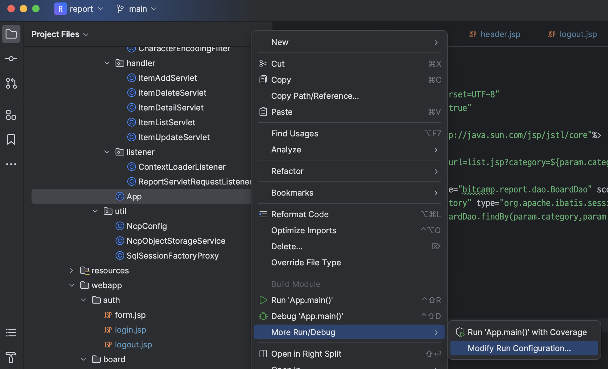 ㄴ App.java 우클릭 > More Run/Debug > Modify Run Configuratioin... 선택