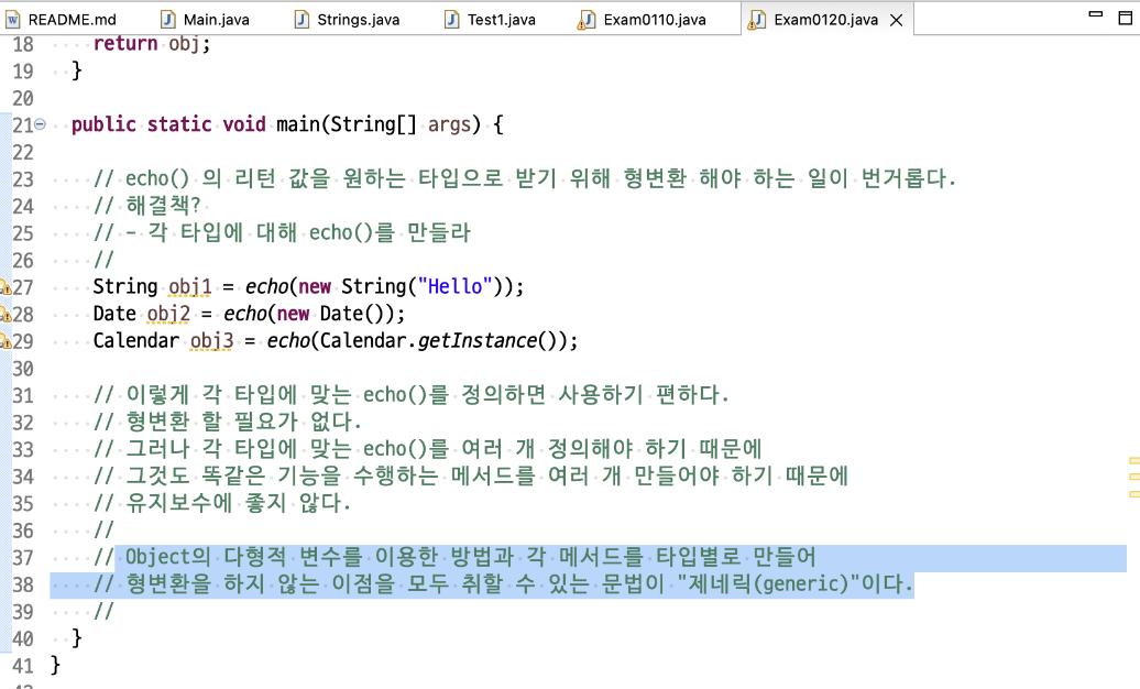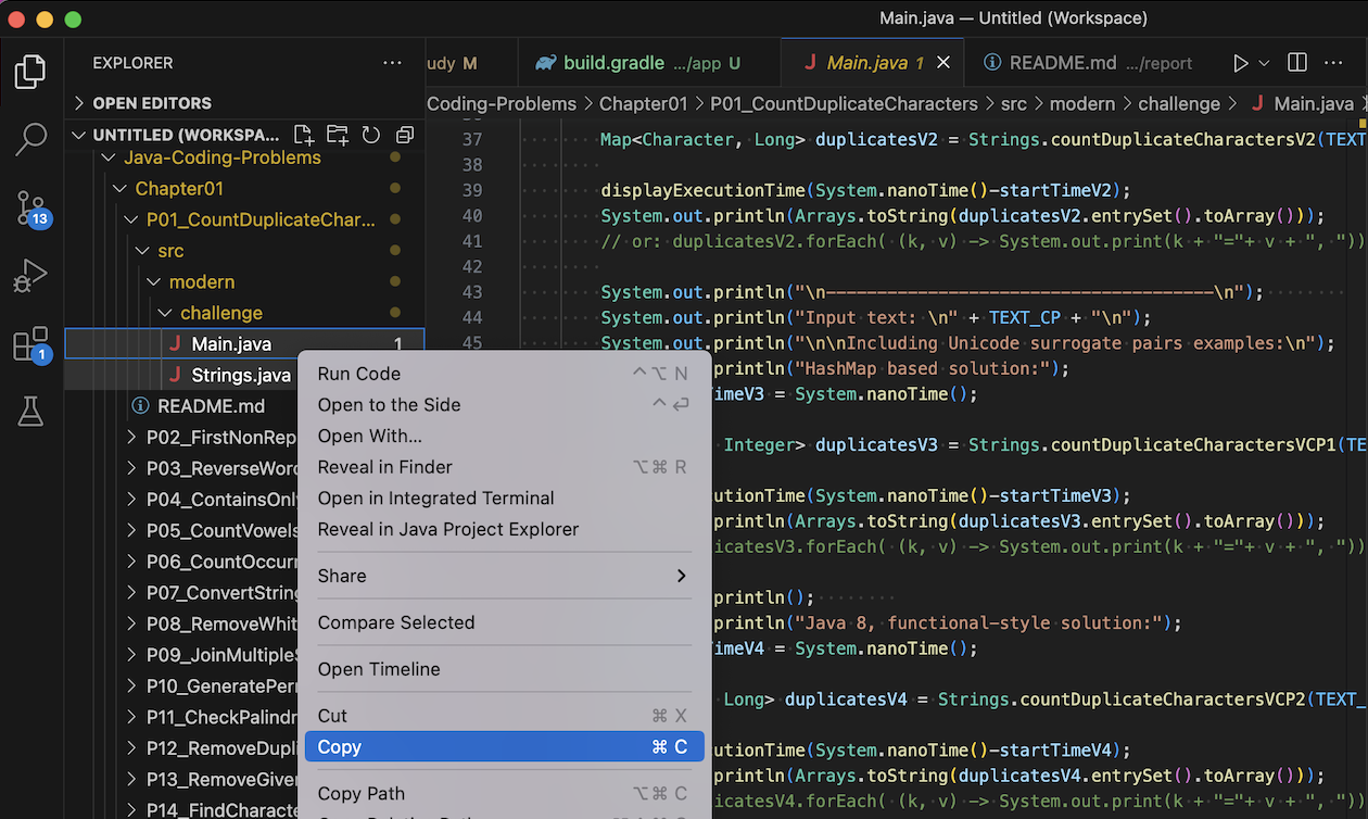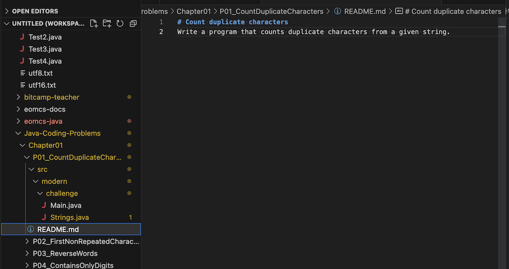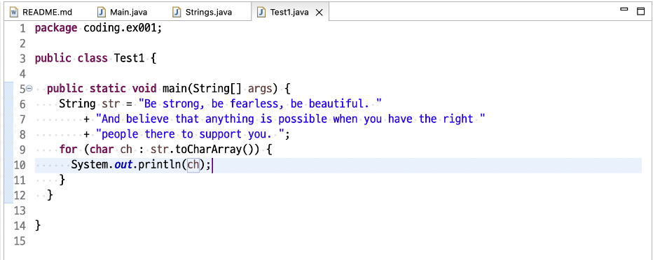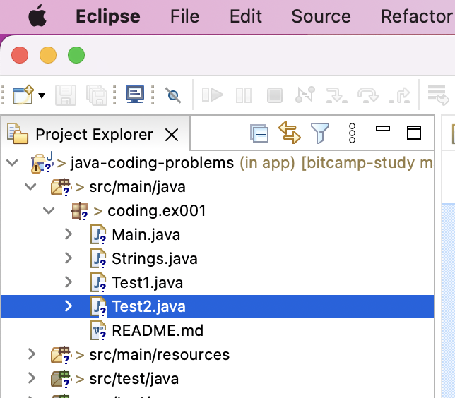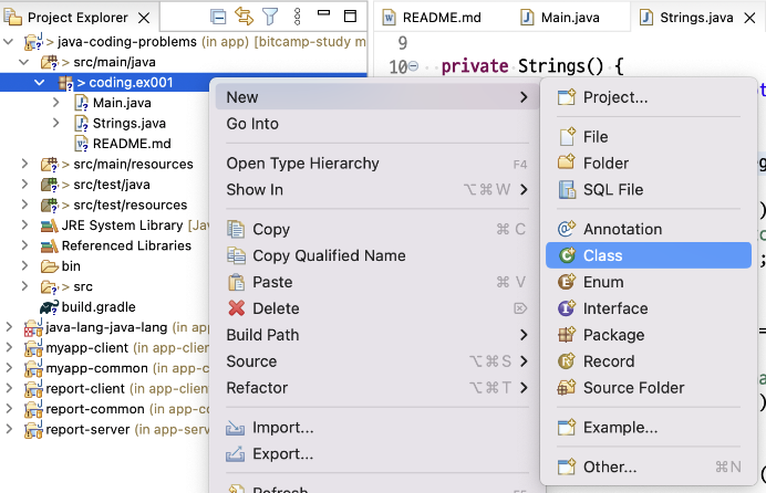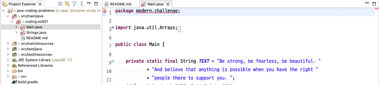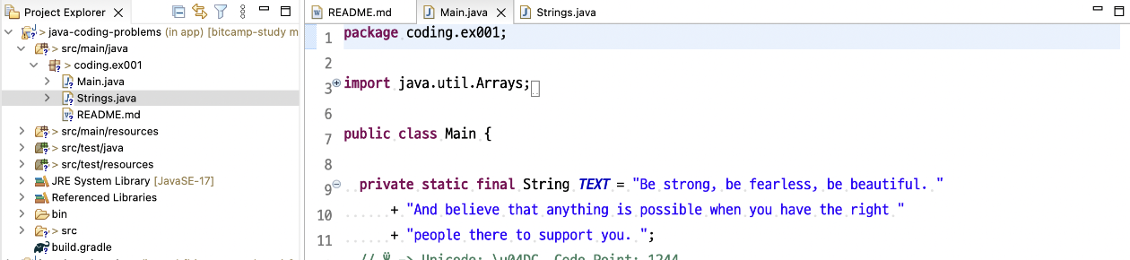 ㄴ 해당 Main.java, Strings.java 클래스 복사해서 위에서 생성한 java-coding-problems 프로젝트의 coding.ex011 패키지에 붙여넣기