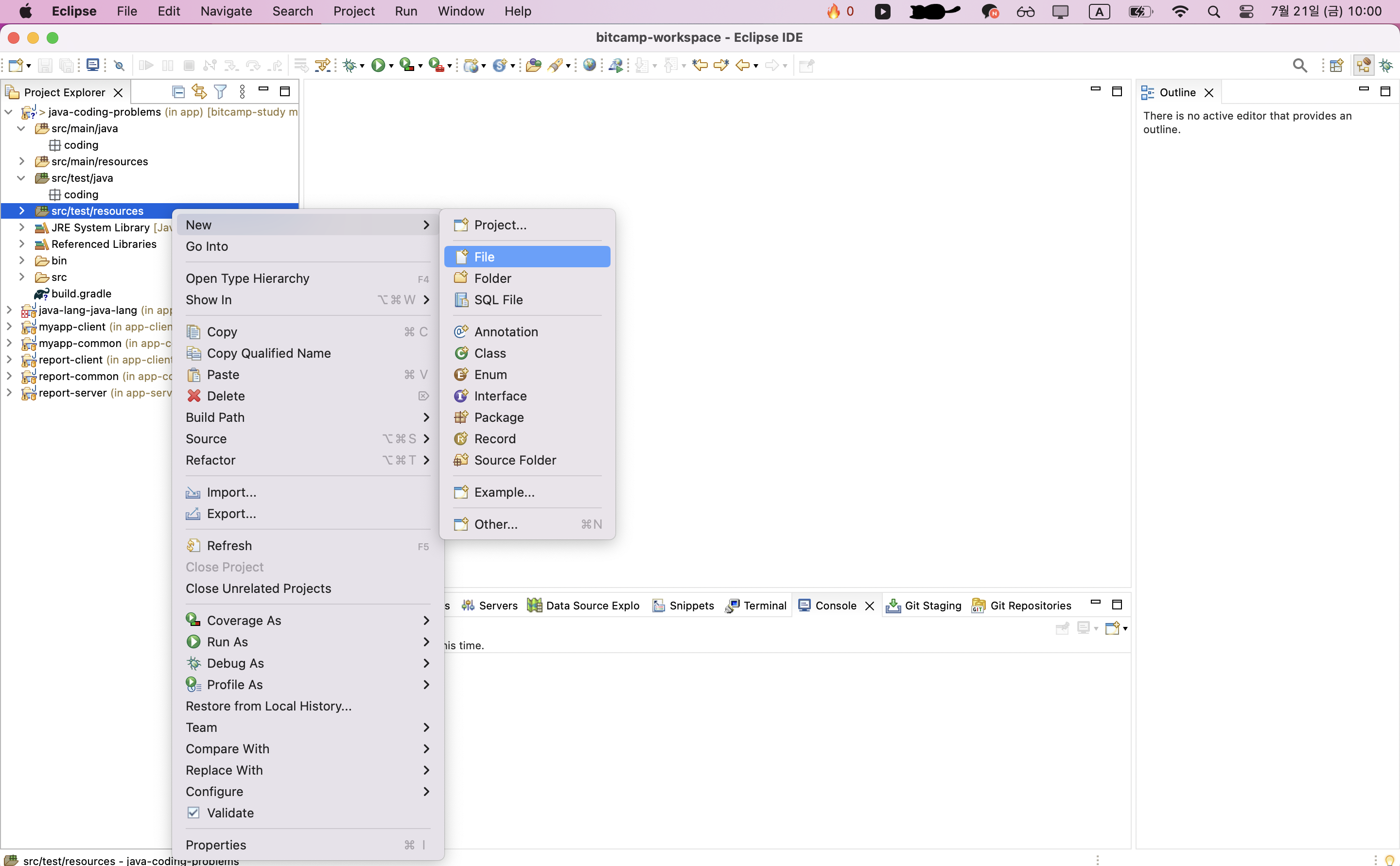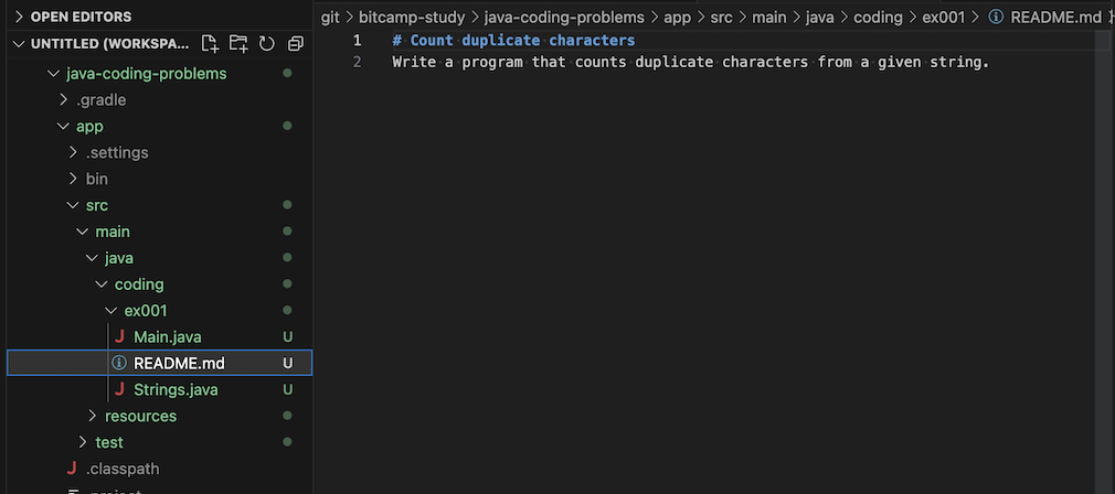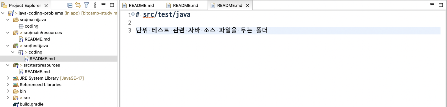 ㄴ src/test/java 경로의 coding 패키지 밑에 README.md 파일 생성하여 위와 같이 작성