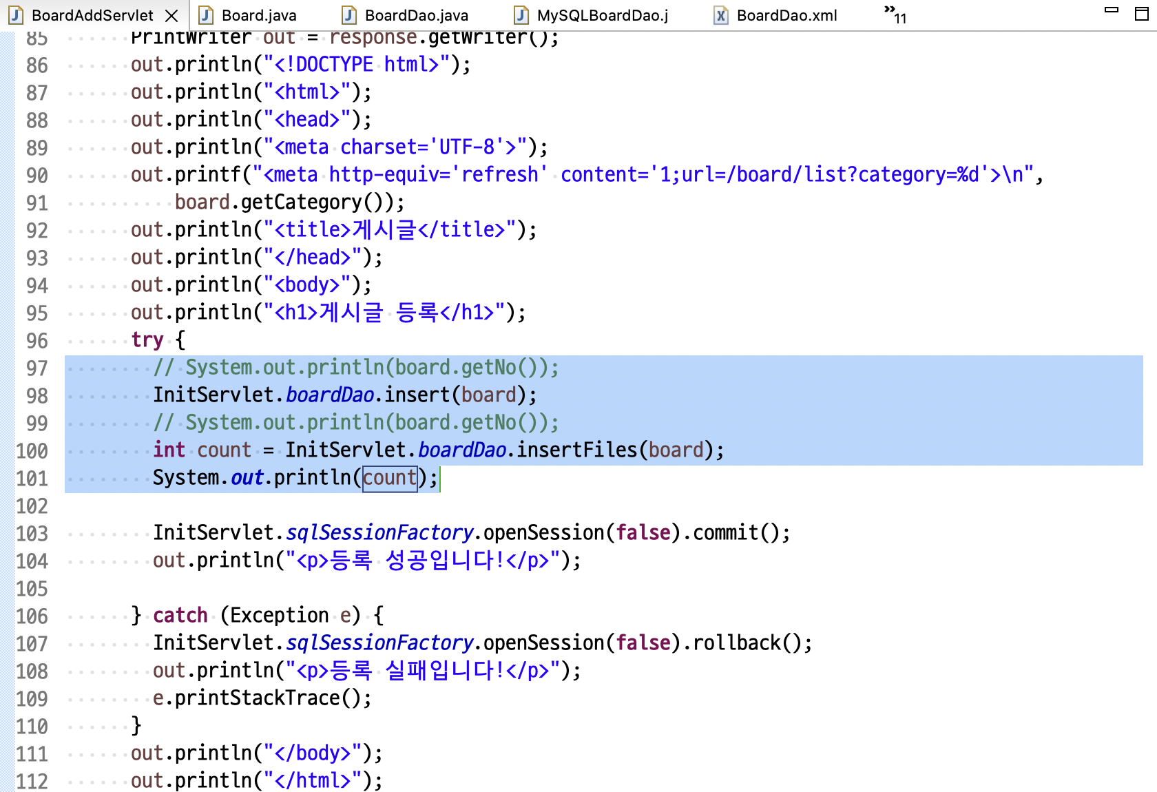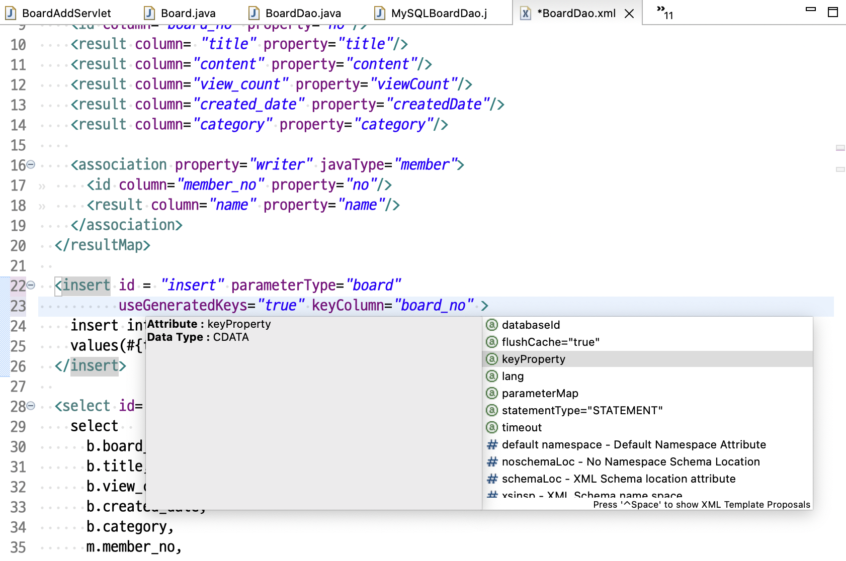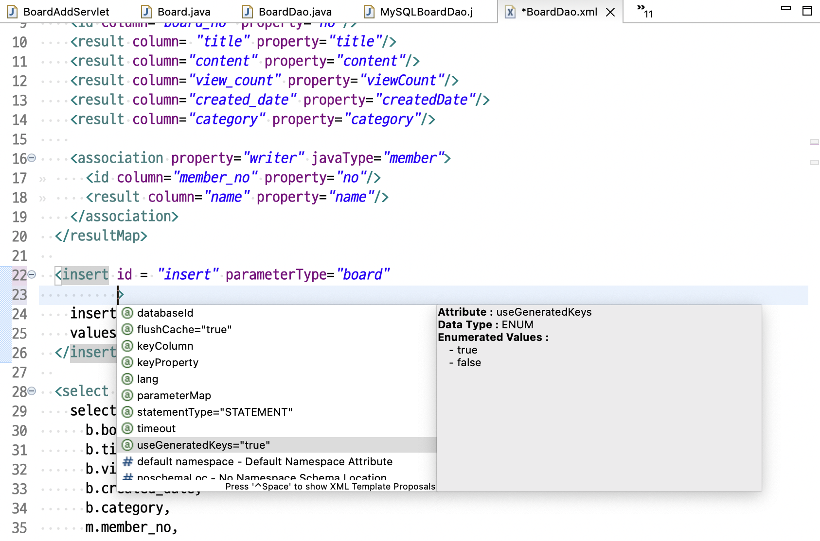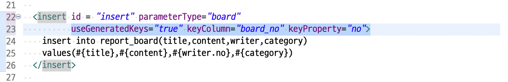 ㄴ keyColumn: 자동 생성된 키 값을 받을 컬럼의 이름을 지정 ("board_no" 컬럼을 사용하여 자동 생성된 키 값을 받음)