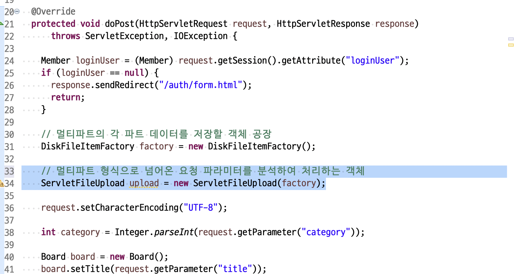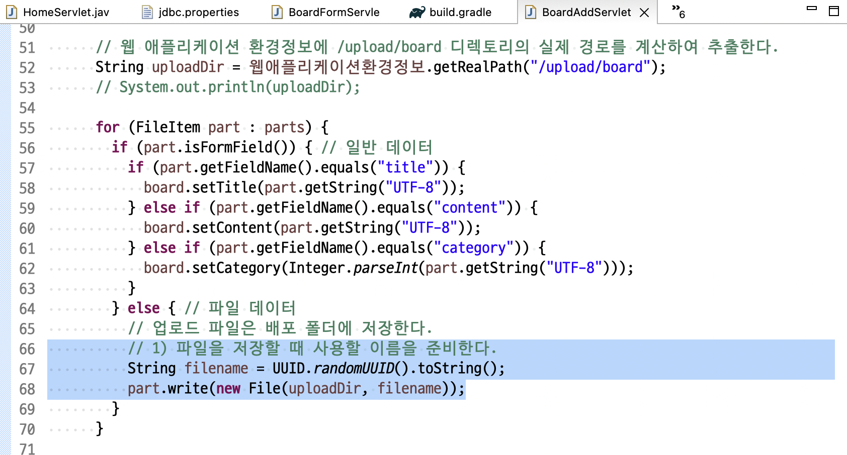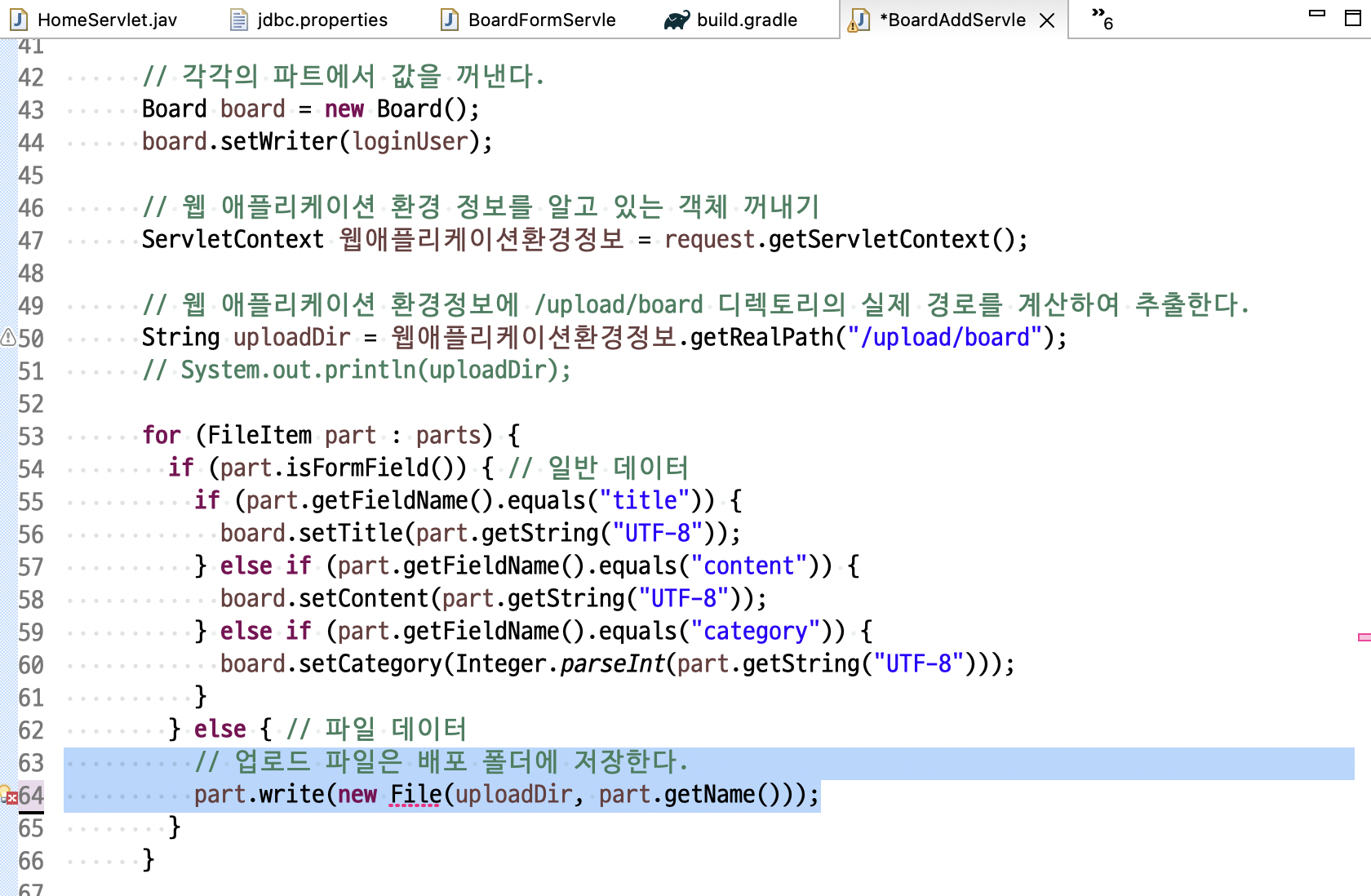 ㄴ 웹 애플리케이션 환경 정보를 알고 있는 객체를 꺼내고, 웹 애플리케이션 환경정보에 /upload/board 디렉토리의 실제 경로를 계산하여 추출하도록 함