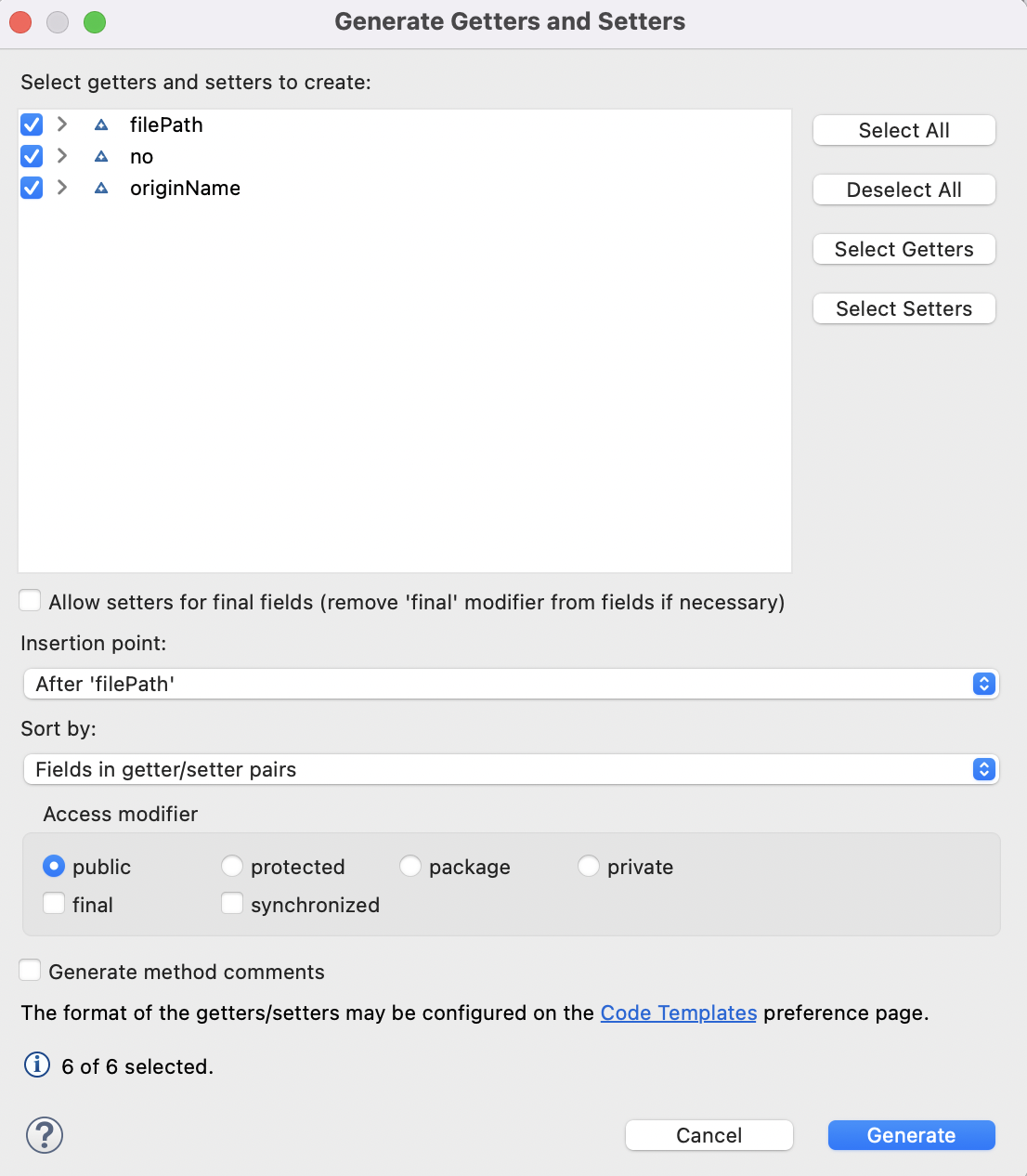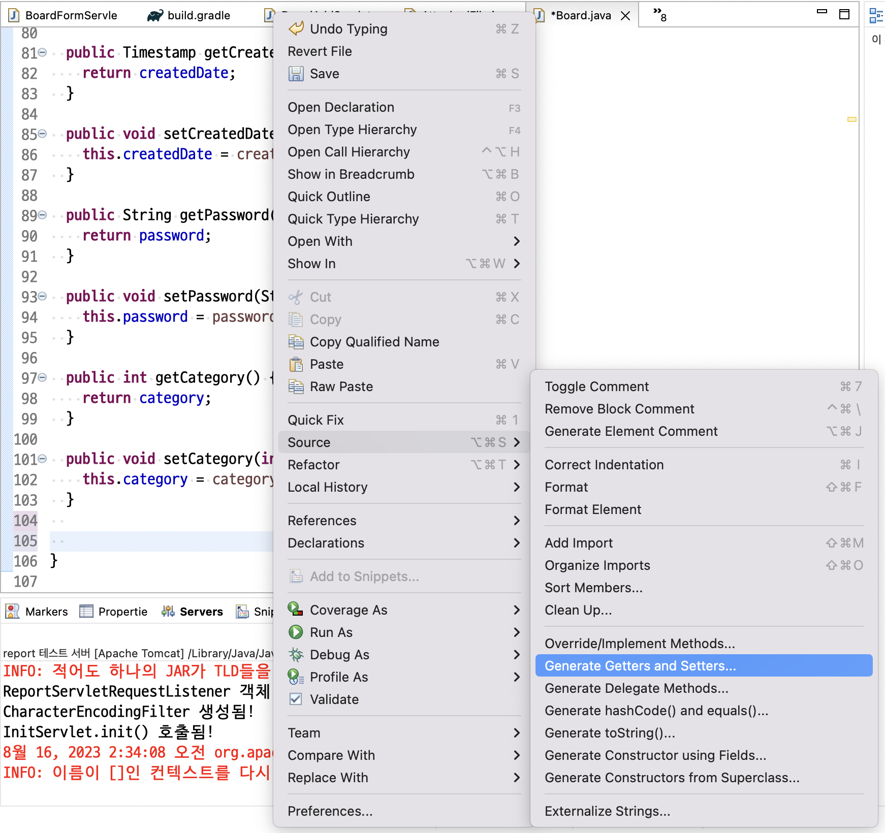 ㄴ 필드 생성 및 Getter/Setter 생성