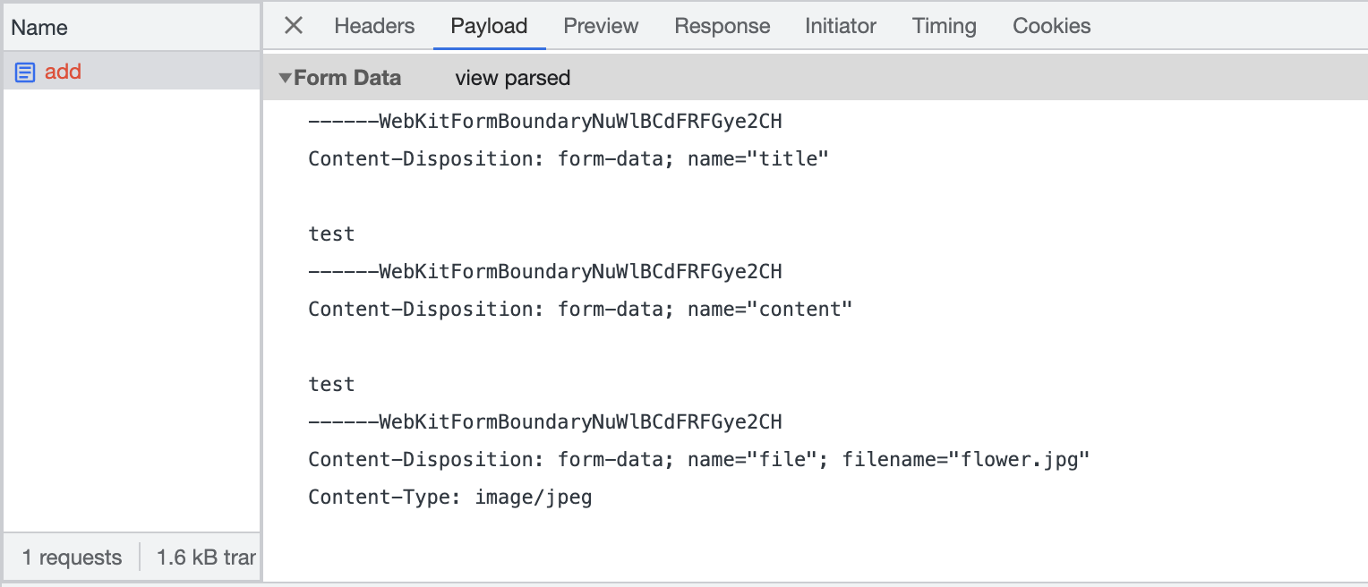 ㄴ 등록 선택 후 개발자도구의 Payload 탭에서 filename 전달됨을 확인